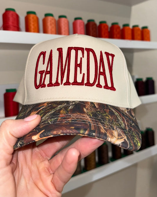 GAMEDAY Puff Embroidered Hat on Canvas Trucker with Camo Bill