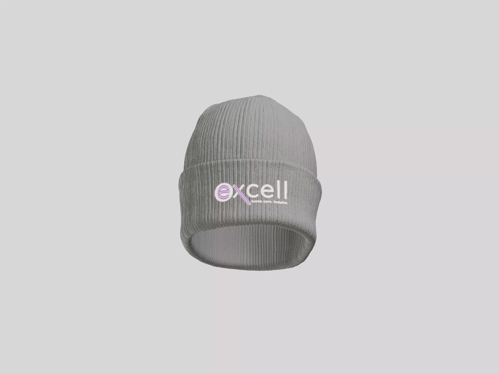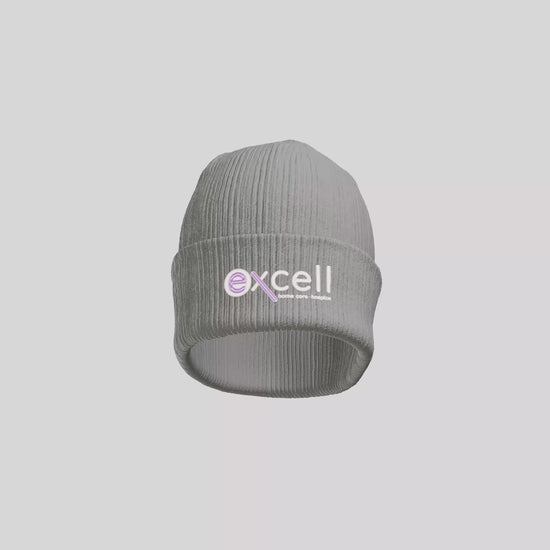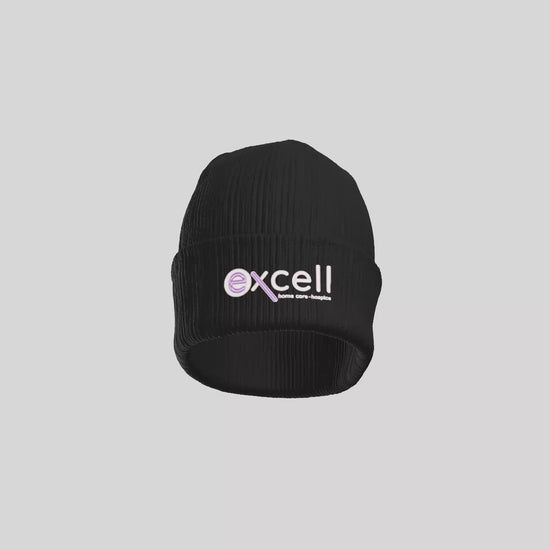 The Excell logo will be embroidered onto the cuff of the beanie with white and lavender lettering. Logo will be embroidered on a Port Authority Cozy Cuffed Beanie in either Deep Black or Gusty Grey.